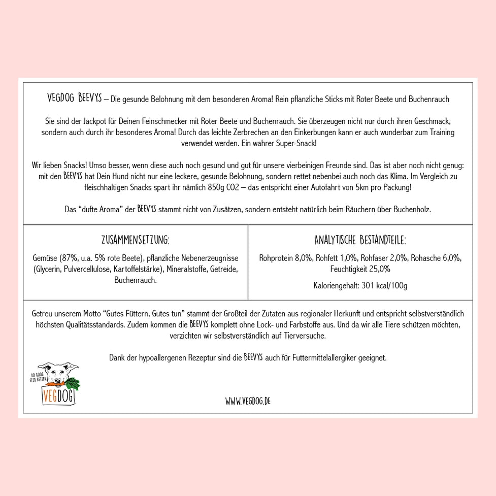 Würziger Buchenrauch trifft auf kraftvolle Rote Bete: Die VEGDOG BEEVYS bieten deinem Hund ein besonderes Geschmackserlebnis – perfekt als kleine Belohnung beim Training oder auf der täglichen Gassirunde.