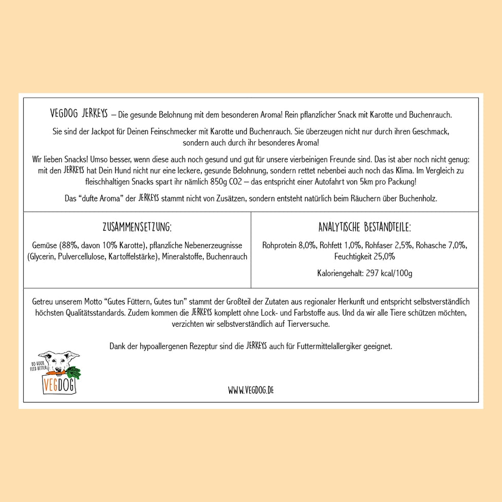 Gesund snacken? Mit den VEGDOG JERKEYS kein Problem! Die veganen Leckerbissen bestehen aus nährstoffreicher Karotte und werden traditionell über Buchenholz geräuchert – für ein unwiderstehliches Aroma, das sowohl Hunde als auch Halter begeistert.